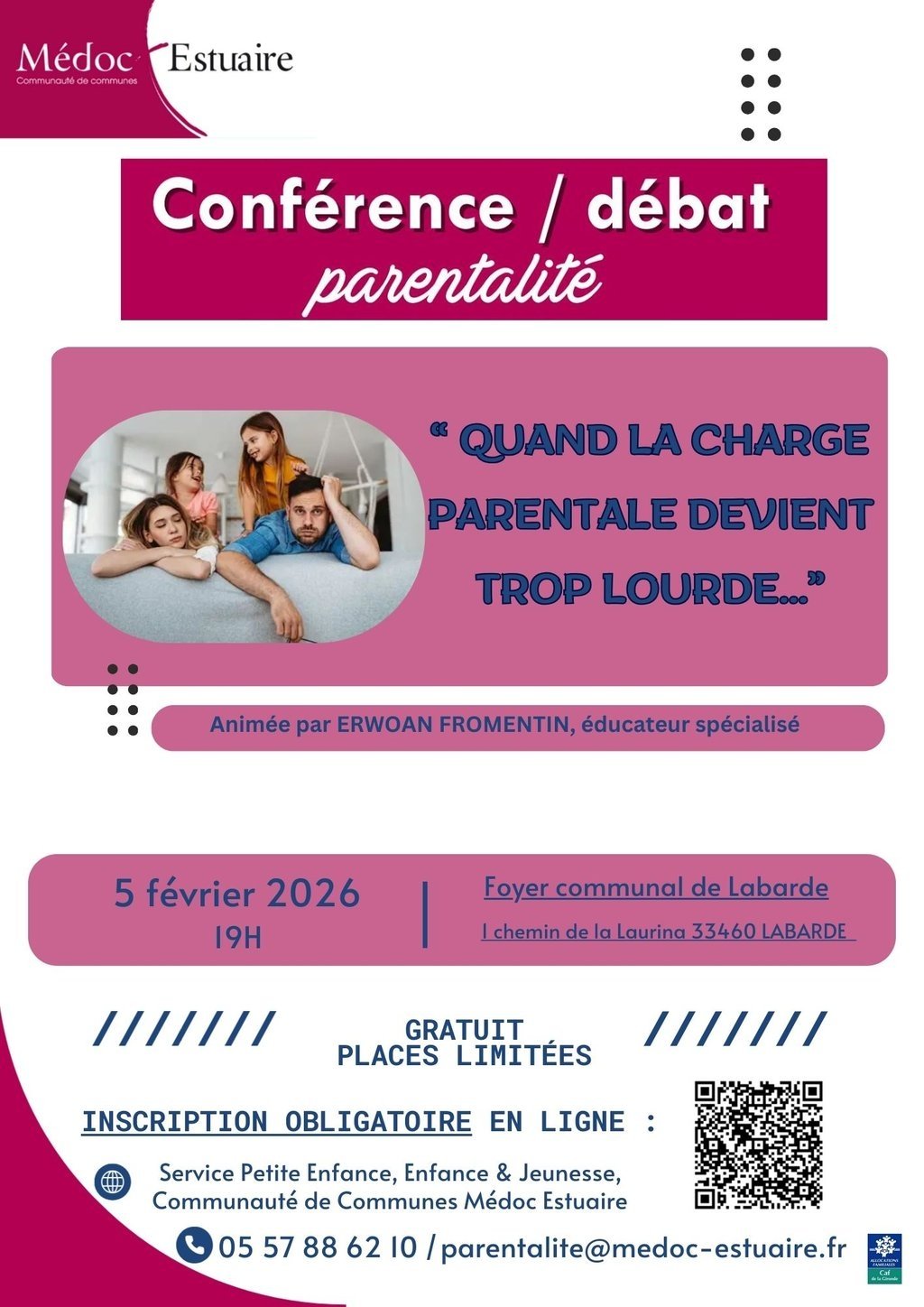 La première conférence est organisée le 5 février à 19h à Labarde (Foyer communal) sur la thématique de la surcharge parentale, car de nombreux parents jonglent chaque jour entre leurs rôles à la maison, au travail et dans leur vie personnelle. Cette charge mentale constante, combinée au stress et à la fatigue, peut mener à une saturation parentale, un état d’épuisement qui affecte le bien-être de toute la famille.