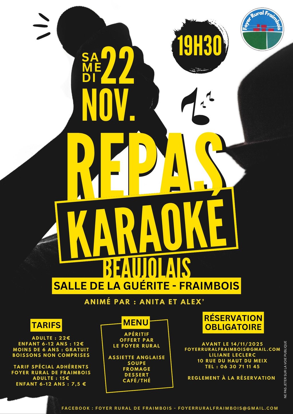 Le Foyer Rural de Fraimbois vous invite à une soirée conviviale autour d'un repas Karaoké - Beaujolais, le samedi 22 novembre 2025 à 19h30, à la salle de la Guérite à Fraimbois.