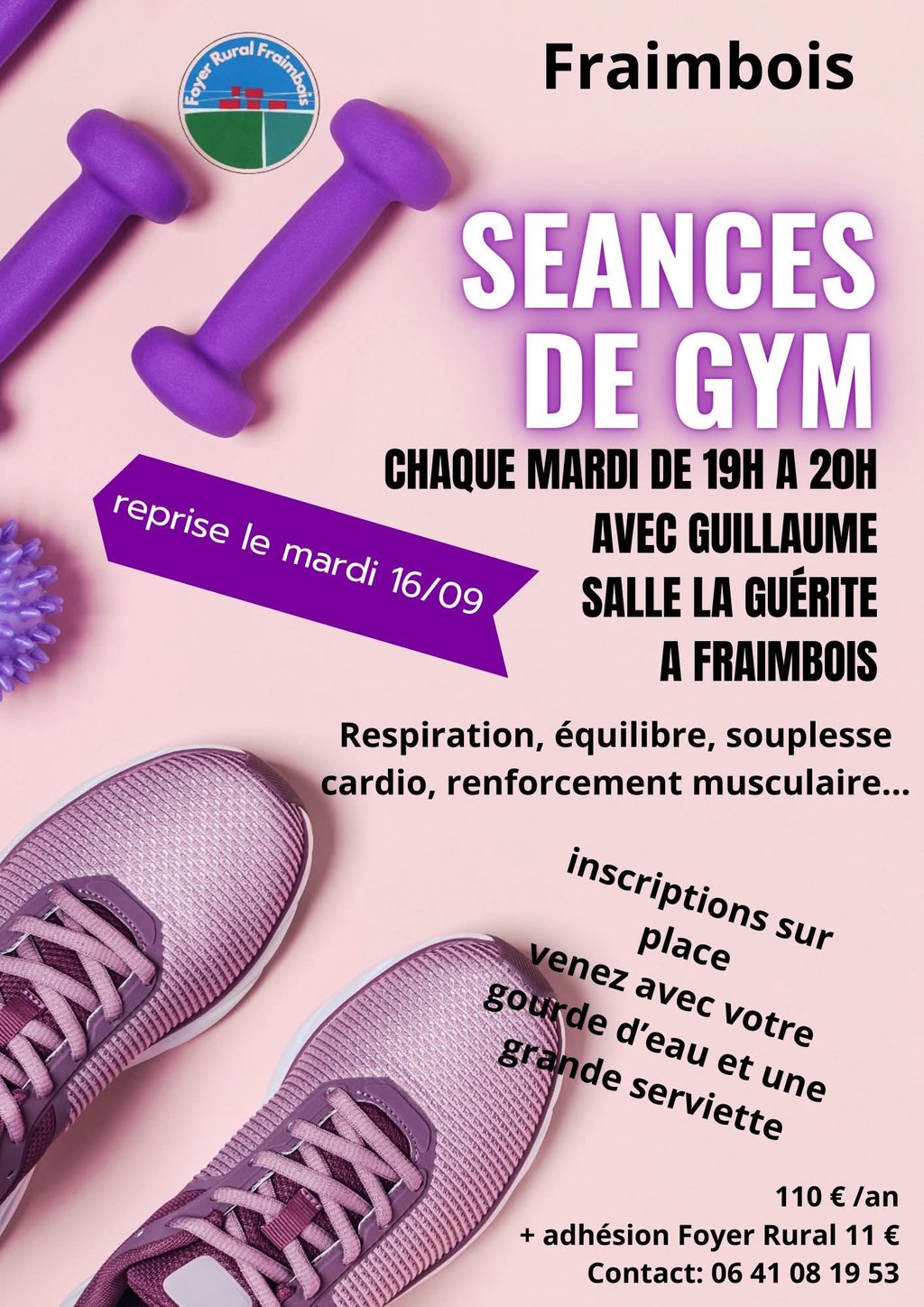 Le foyer rural de Fraimbois vous propose une séance de gym chaque mardi de 19h à 20h (sauf pendant les vacances scolaires) à la salle de la guérite.