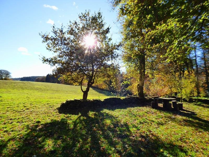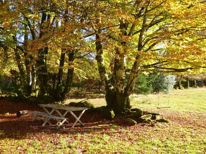 Aire ombragée sur le sentier "Le tour du lac de Vesoles", le GR de Pays "Tours des Monts et Lacs en Haut-Languedoc et la piste VTT n°1.