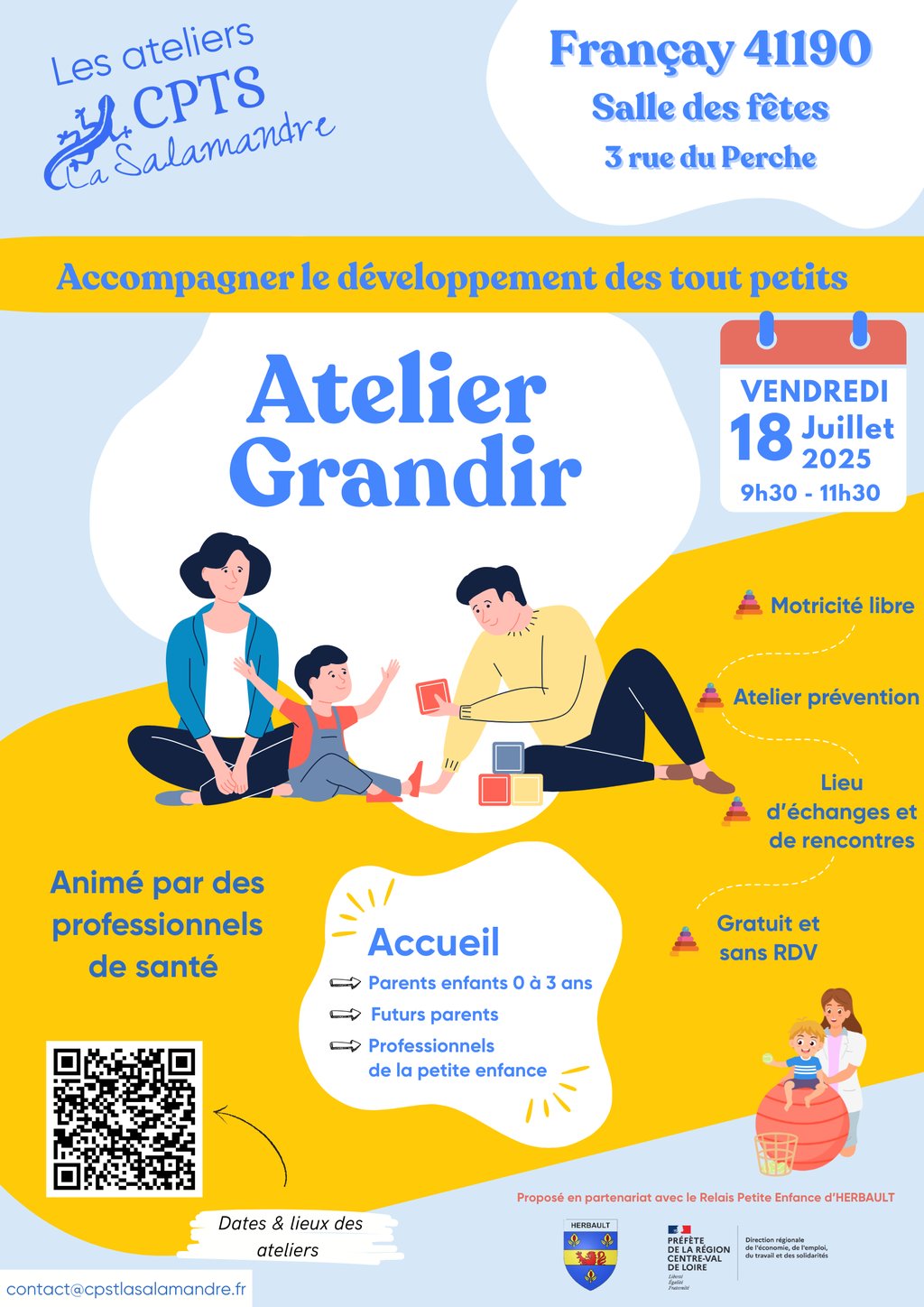 L'atelier GRANDIR organisé par le CNPTS de La Salamandre en partenariat avec le Relais Petite Enfance de Veuzain sur Loire aura lieu mercredi 18 février 2026 de 9h30 à 11h30 salle Abel Genty, 5 rue Gustave Marc à Veuzain-sur-Loire (41150).