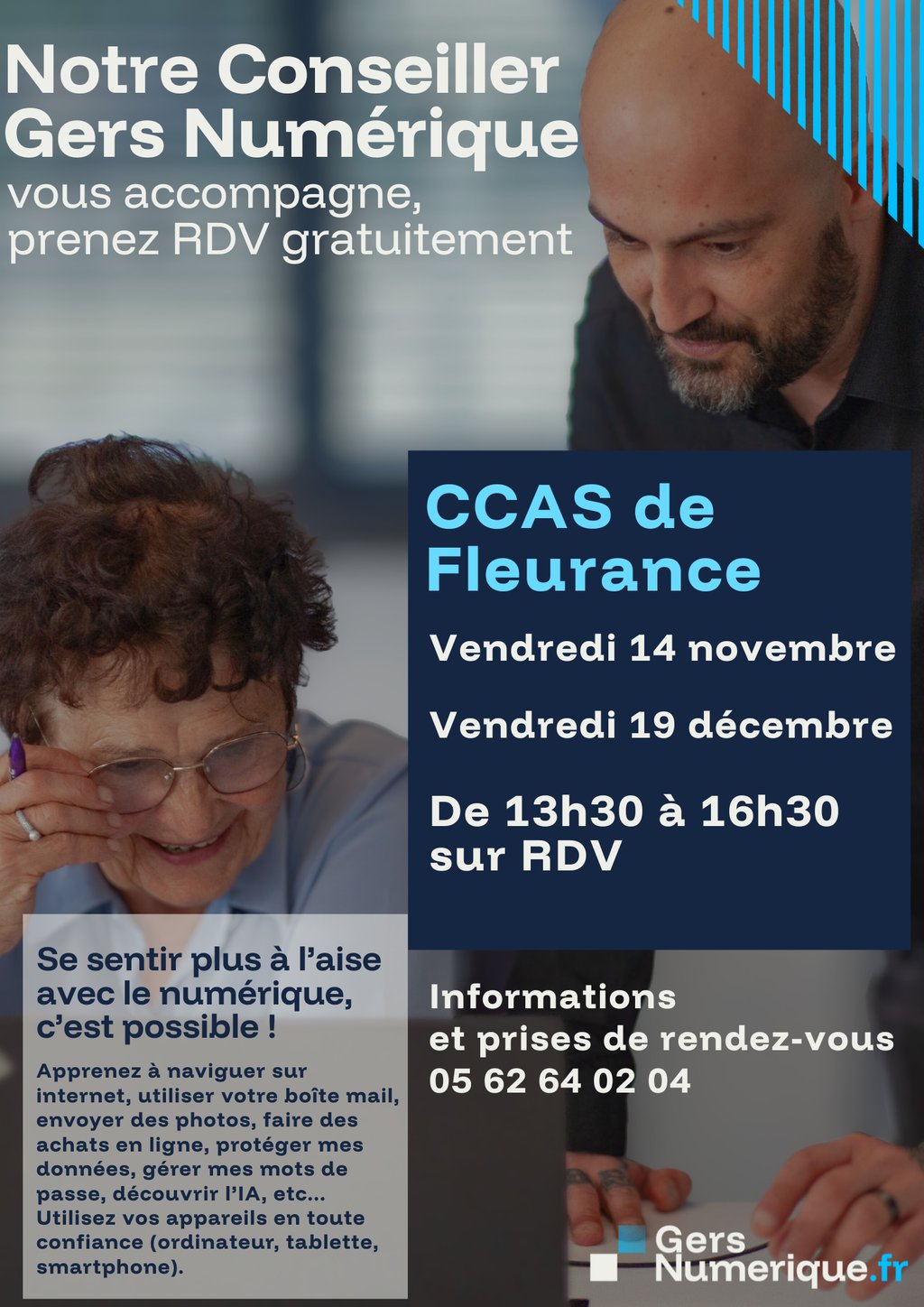 📍 Le conseiller Gers Numérique se déplace au plus près de chez vous pour vous accompagner gratuitement et individuellement sous forme d'atelier.