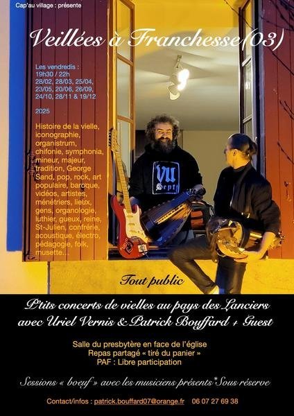 Un vendredi par mois, de 19h30 à 22h, venez partager une soirée chaleureuse autour de la vielle à roue, dans la salle du presbytère face à l’église. Ces veillées, animées par Uriel Vernis et Patrick Bouffard, accompagnés de musiciens invités, mêlent concerts intimistes, découvertes musicales, et rencontres conviviales.