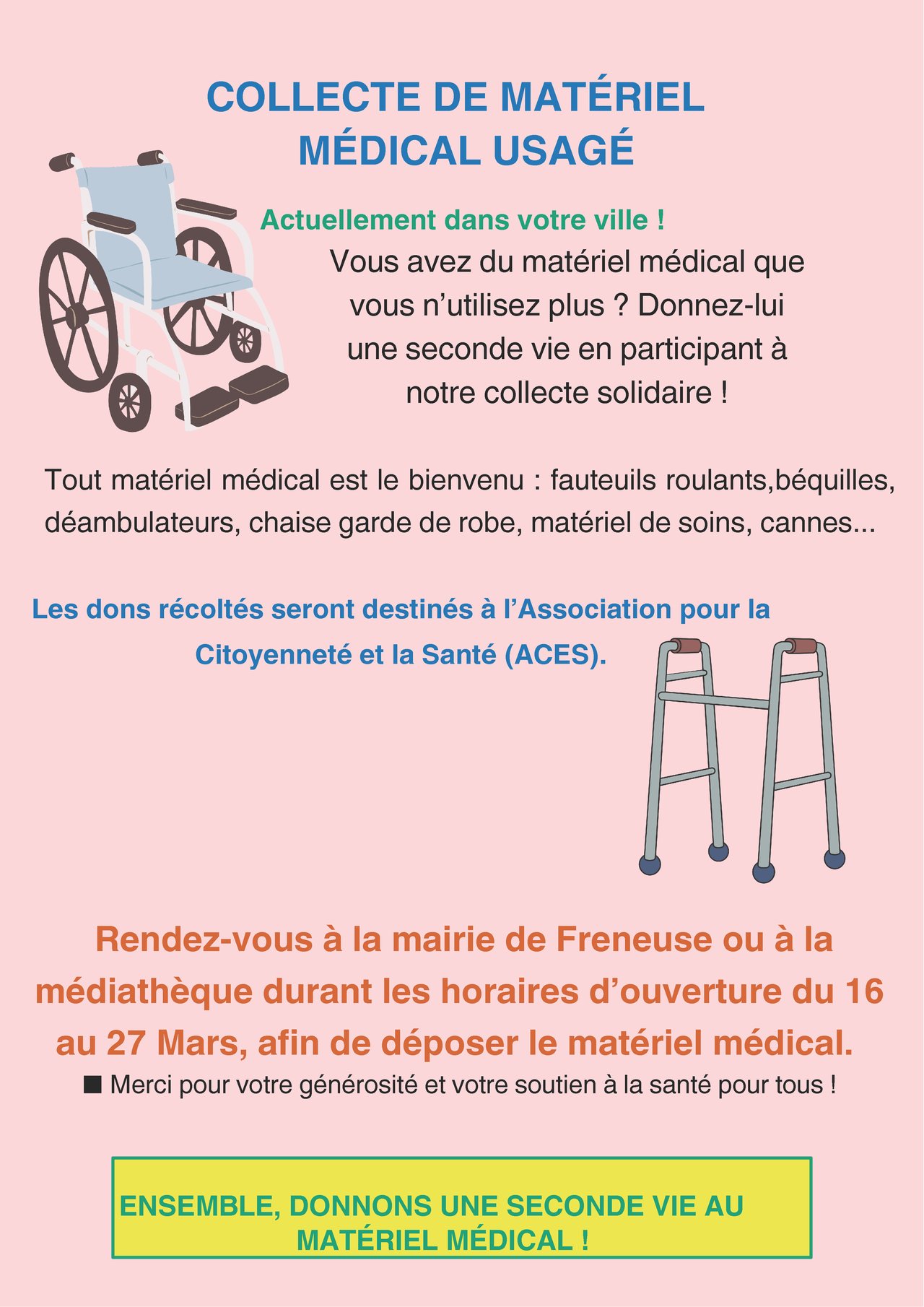 ♿ Matériel accepté : Tout équipement en bon état (fauteuils roulants, béquilles, déambulateurs, chaise garde de robe, matériel de soins, cannes...)