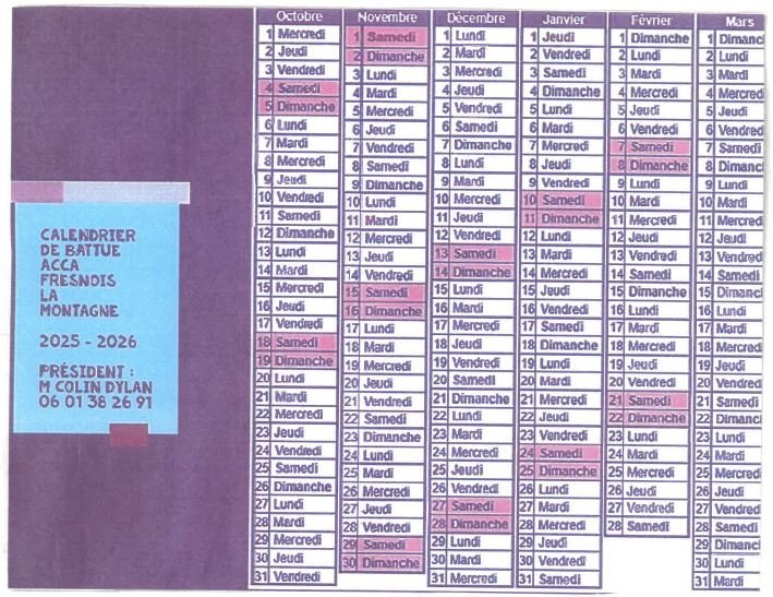 Veuillez trouver ci-dessus le calendrier mentionnant les dates de chasse pour l'année 2025/2026.