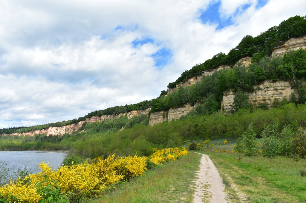 À la Carrière Barrois de Freyming-Merlebach, des falaises bigarrées d’ocre tantôt rose ou jaune, nous transportent dans un paysage de canyon. Son belvédère à 80m de hauteur dévoile les étangs qui ont depuis longtemps remplacé les machines. En effet, le grès était concassé en sable pour le remblai des chantiers d’extraction minière. Façonnée par l’Homme, réclamée par Dame Nature, la carrière a un nouveau visage. Elle est autant un refuge pour le pélobate brun, le crapaud vert, le hibou grand-duc et les chauve-souris, qui nichent dans les falaises, qu’un terrain de jeu pour les mammifères, les poissons et les insectes, notamment les délicates libellules. Les fleurs sauvages s’épanouissent comme des gouttes de couleur au milieu des vastes étendues vert émeraude.