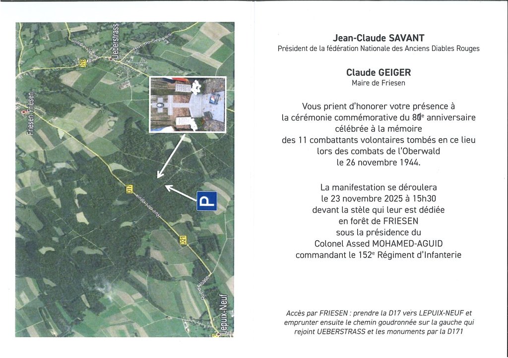 La manifestation se déroulera devant la stèle qui leur est dédiée en forêt de FRIESEN sous la présidence du Colonel Assed MOHAMED-AGUID commandant le 152è Régiment d'Infanterie.