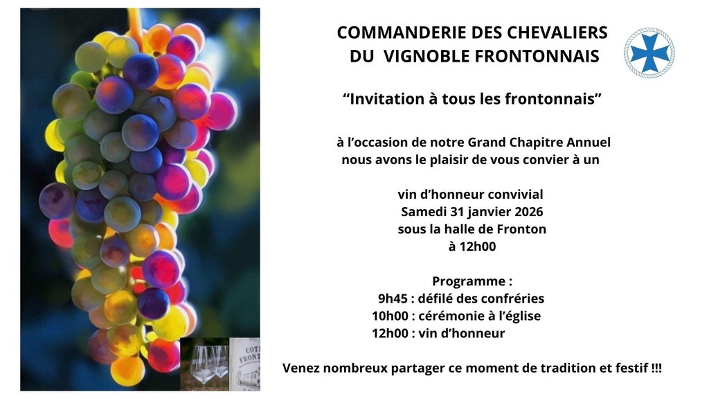 A l'occasion de son Grand Chapitre annuel, la Commanderie des chevaliers du vignoble Frontonnais vous invite à son vin d'honneur le 31 janvier 2026.