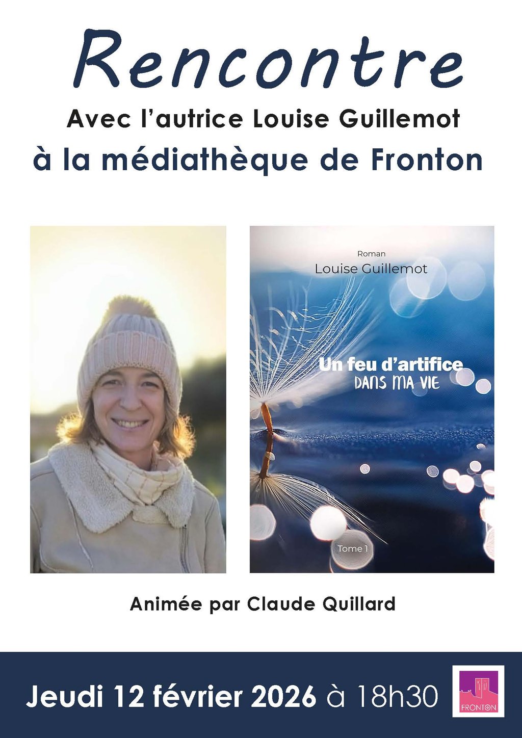 La médiathèque de Fronton, avec la participation de Claude Quillard, a le plaisir de vous inviter à une soirée exceptionnelle en compagnie de Louise Guillemot, autrice Frontonnaise.