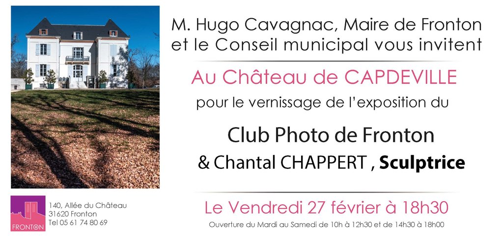 Rendez-vous ce soir à 18h30 au Château de Capdeville pour le vernissage de la sculptrice Chantal CHAPPERT et du Club Photo de Fronton.