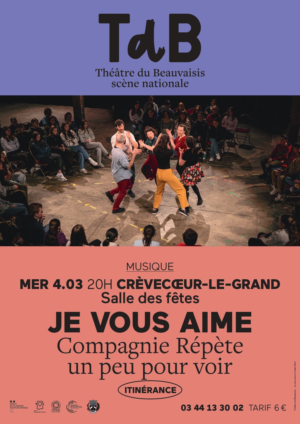 Le mercredi 4 mars 2026 à 20h, la Salle des Fêtes de Crèvecœur-le-Grand accueille le spectacle Je vous aime, proposé par le Théâtre du Beauvaisis en partenariat avec la Ville, dans le cadre du programme Itinérance.
