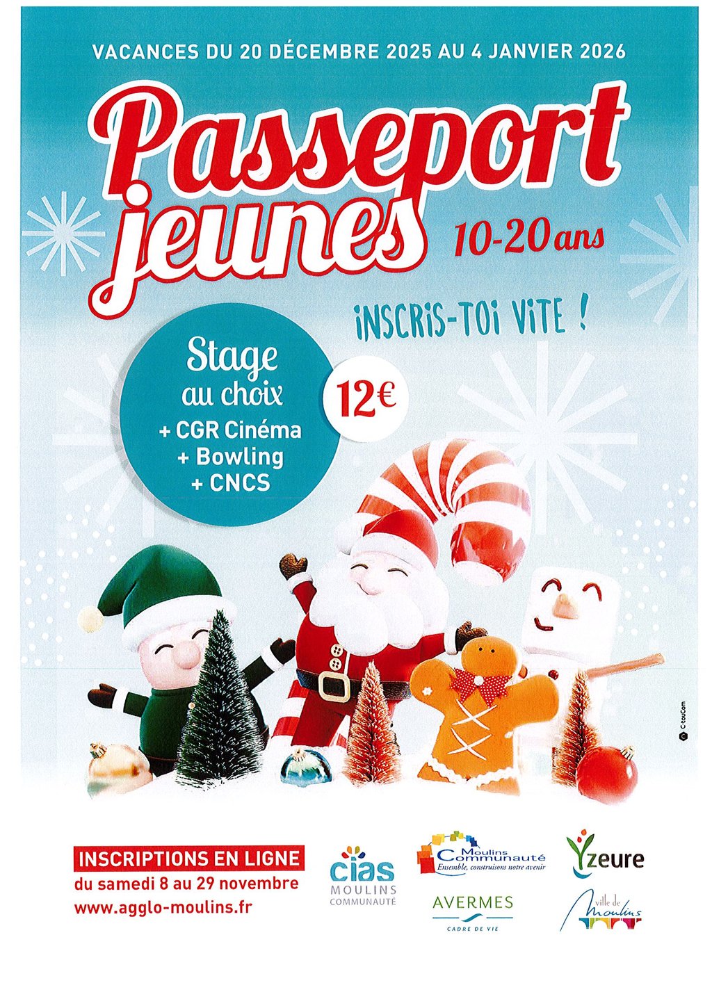 Pour les vacances de Noël, du 20 décembre 2025 au 4 janvier 2026, Moulins Communauté, par le biais de son CIAS, reconduit l’opération « Passeport Jeunes ». A compter de 2025, le passeport passe de 10 à 12 €.