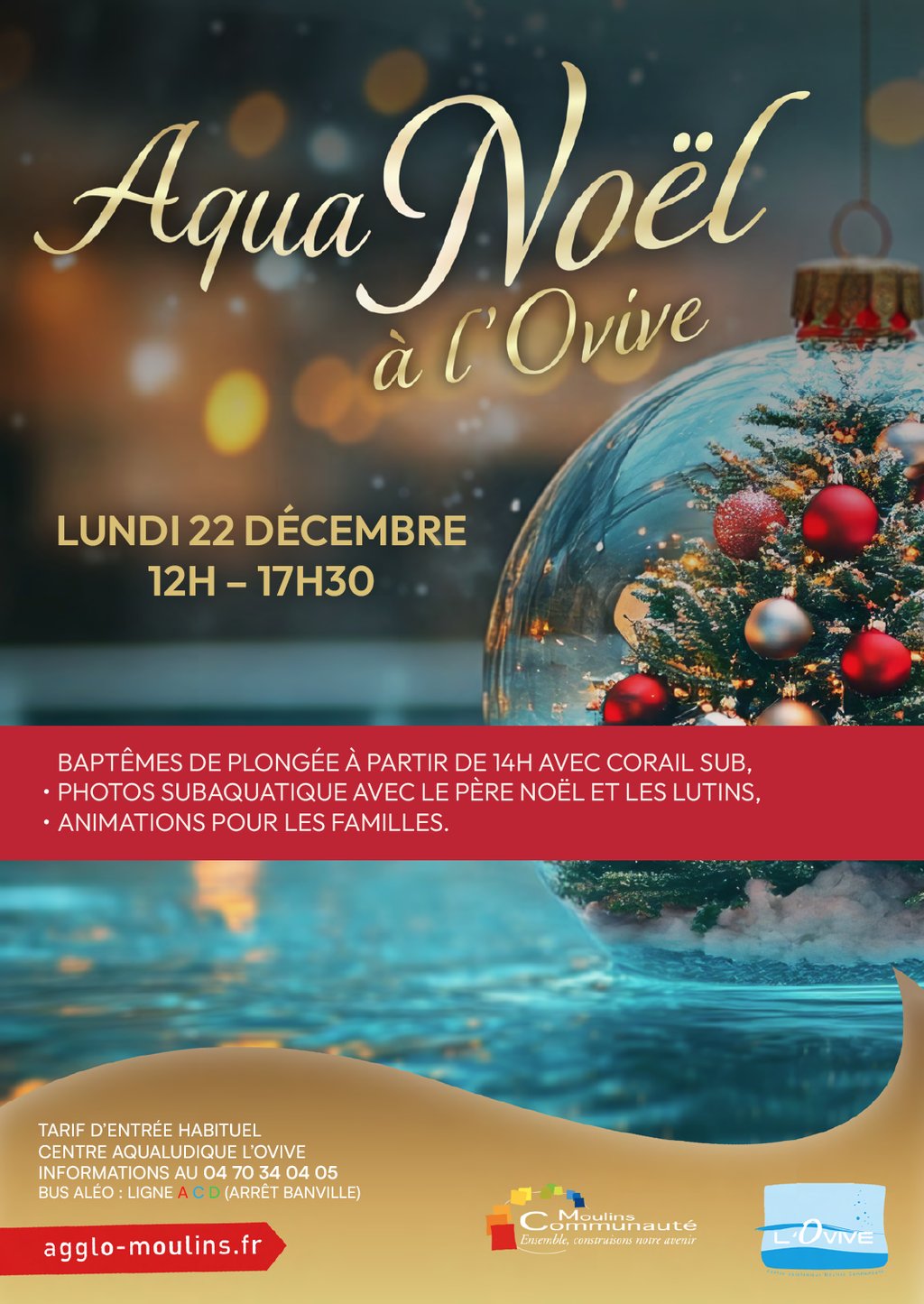 Rendez-vous incontournable le lundi 22 décembre pour AquaNoël : de 12h à 17h30, vivez un moment féérique en famille avec animations, initiations à la plongée (dès 14h avec Corail Sub) et photos subaquatiques avec le Père Noël et ses lutins. Informations au 04 70 34 04 05.