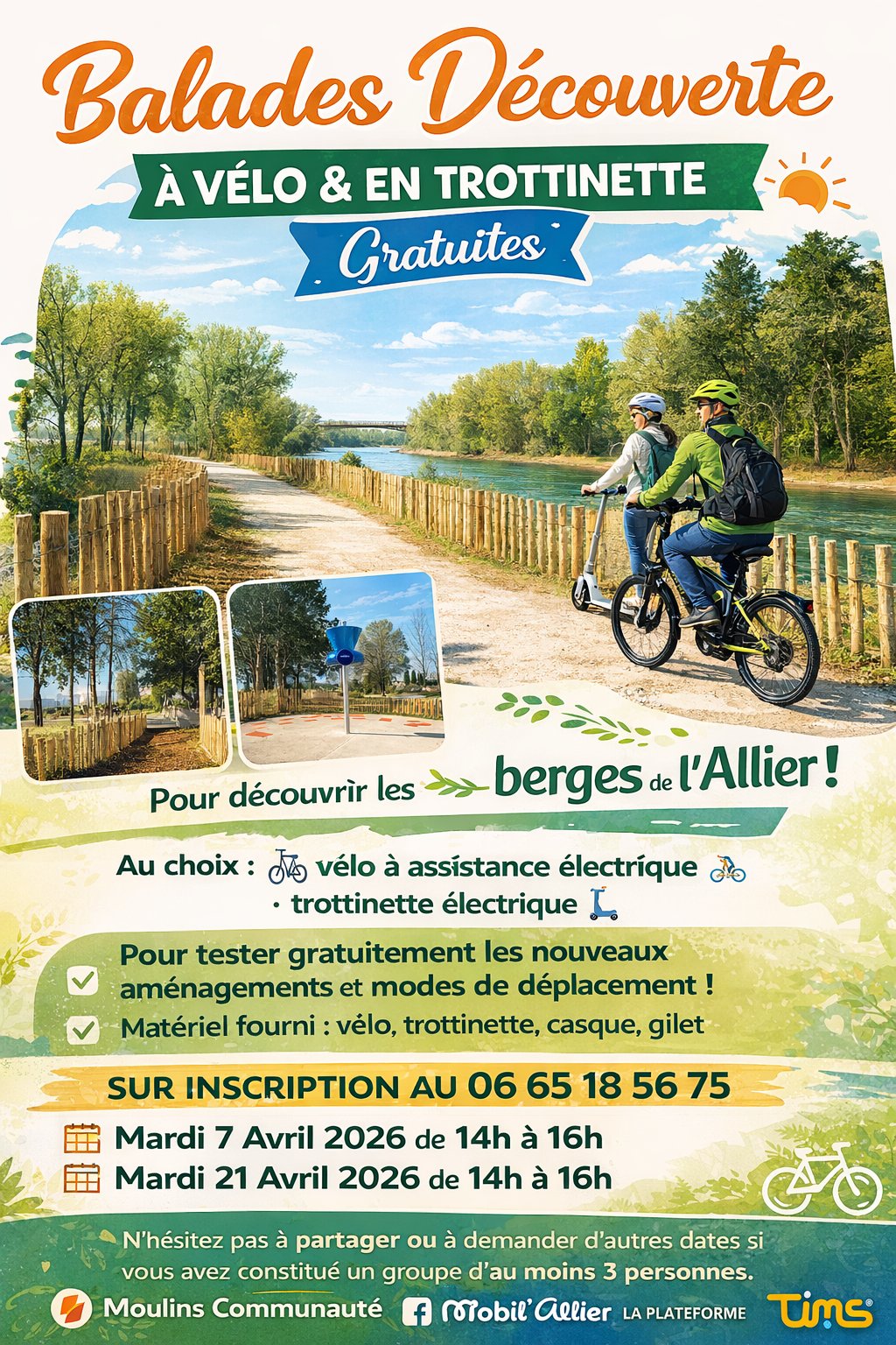 Dans le cadre du programme TIMS - Territoires Inclusion Mobilité Sobriété - visant à promouvoir l’écomobilité sur le département, Mobil'Allier vous propose des balades à vélo à assistance électrique ou en trottinette électrique, dans le but de tester ces modes de transport et de découvrir par la même occasion les aménagements du territoire.