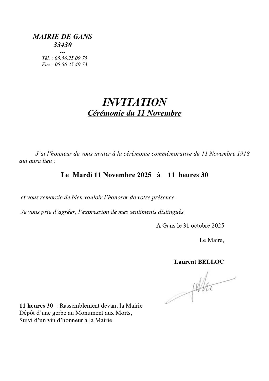 Vous êtes invités à la cérémonie commémorative du mardi 11 novembre 2025,