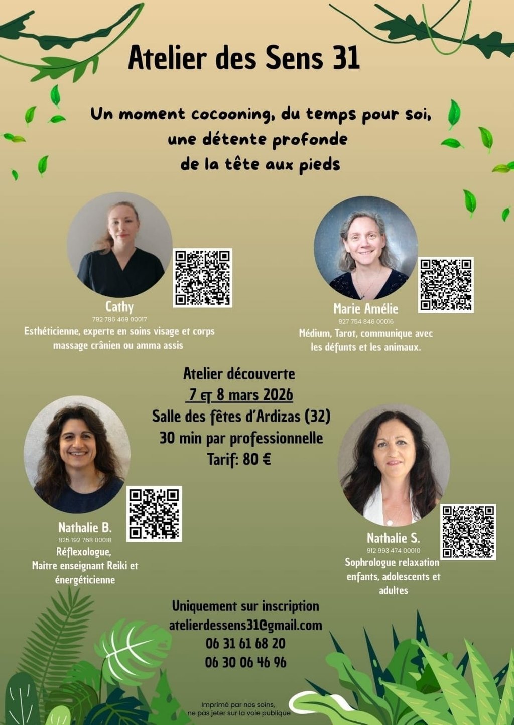 Nous vous proposons un atelier bien-être découverte les 7 et 8 Mars à la salle des fêtes d'Ardizas (32430).Ofrez-vous 2h rien que pour vous ou offre-le à vos proches, et pourquoi pas en famille, entre amis, ou pour une occasion spéciale comme la journée de la femme ? Un véritable cocon de douceur pour relâcher les tensions, apaiser l'esprit et vous reconnecter à votre corps. 30min avec chacune de nos 4 professionnelles du bien-être, des pratiques complémentaires, une parenthèse hors du temps, en petit groupe.