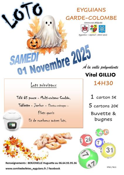 A l'occasion d'Halloween, le Comité des Fêtes d'Eyguians organise son loto. Buvette et bugnes sur place. A gagner : télé 65 pouces, multi-cuiseur Cookéo, tablette, jambon, électroménager, filets garnis et de nombreux autres lots.