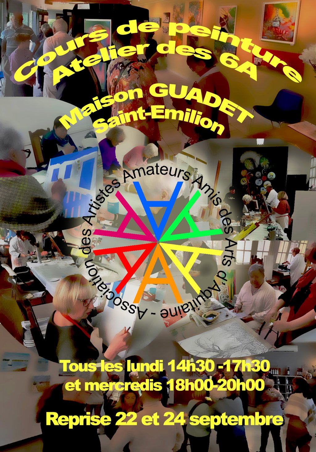 Les cours de peinture de l'Atelier des 6A de Saint-Emilion reprennent tous le lundis de 14h30 à 17h30 et tous les mercredis de 18h00 à 20h00 à partir du 22 septembre sous l'animation de Morgan