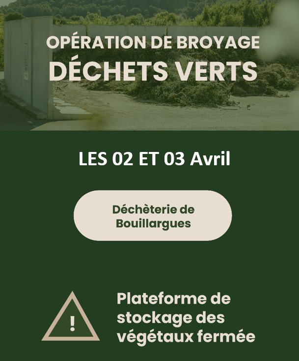 Nîmes Métropole nous informe qu'une opération de broyage des déchets verts est prévue sur la déchèterie de Bouillargues les jeudi 02 et vendredi 03 avril 2026.
