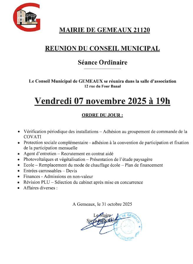 Le Conseil Municipal de GEMEAUX se réunira dans la salle d’association