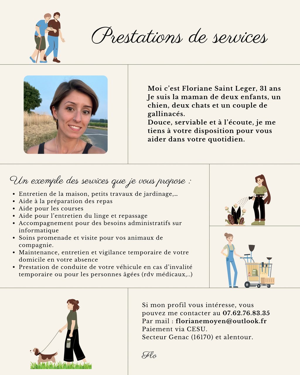 Aide à domicile : entretien de la maison, accompagnement pour les courses, visite, balade et soins aux animaux (formation ACACED en cours)...