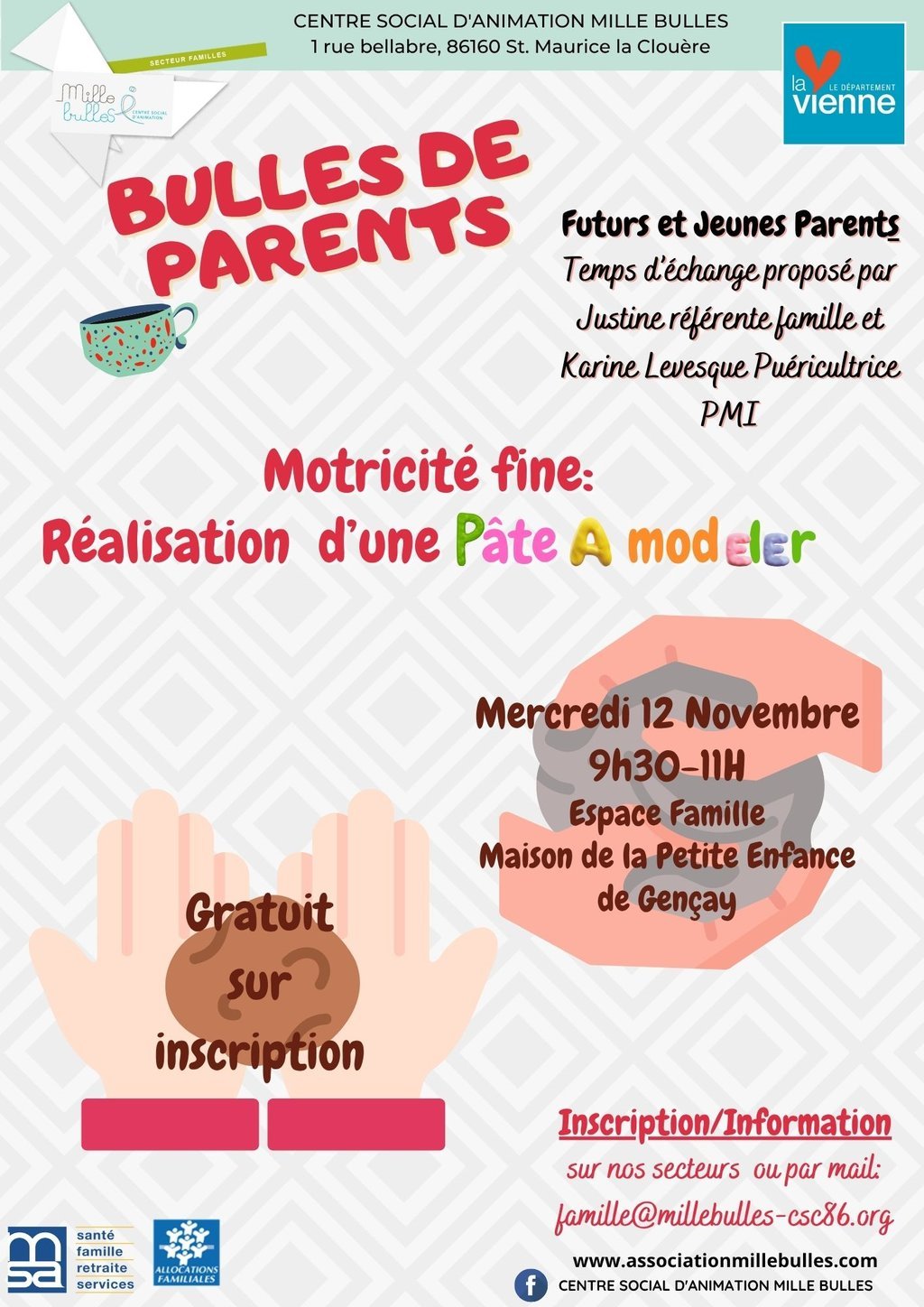 Futurs et Jeunes Parents, temps d'échange proposé par Justine référente famille et Karine Levesque Puéricultrice PMI. Morticité fine : Réalisation d'une Pâte à modeler. Gratuit, sur inscription.