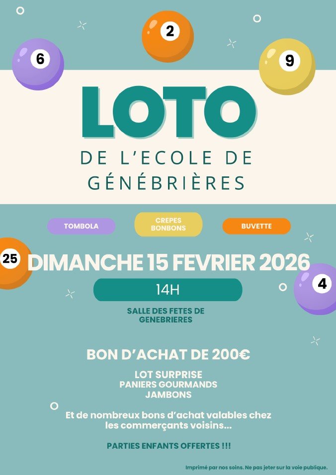 Le dimanche 15 février 2026, l’école de Genebrières vous donne rendez-vous pour un moment chaleureux et festif à ne pas manquer : le loto de l’école 🎱