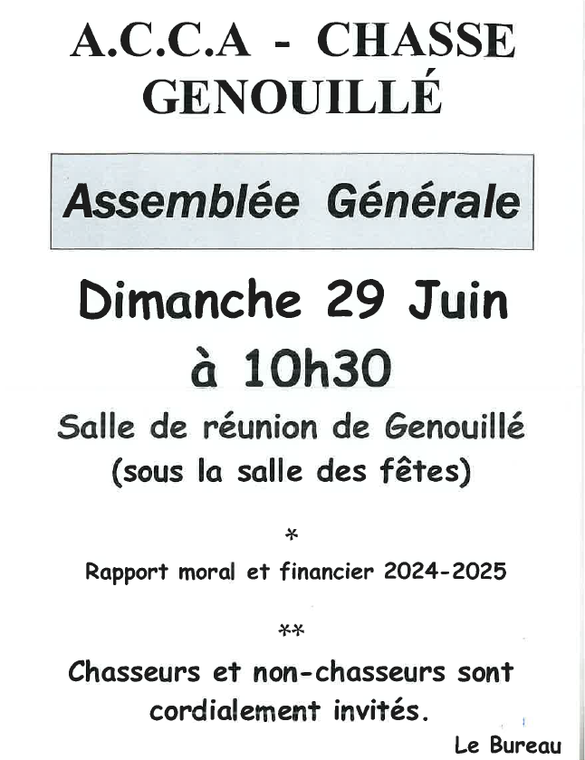 ACCA-CHASSE GENOUILLE - ASSEMBLE GENERALE LE 29 JUIN 2025 À 10H30