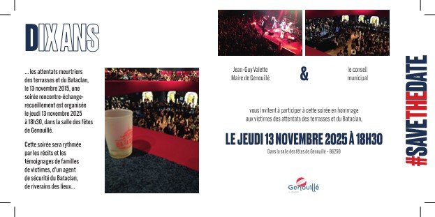 Jean-Guy VALETTE, Maire et le conseil Municipal de Genouillé vous invitent à participer à une soirée en hommage aux victimes des attentats des terrasses et du Bataclan.