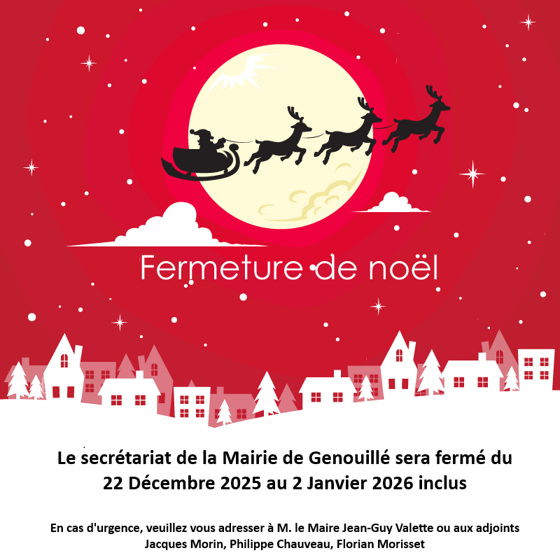 Le secrétariat de la Mairie de Genouillé sera fermé du 22 Décembre 2025 au 2 Janvier 2026.