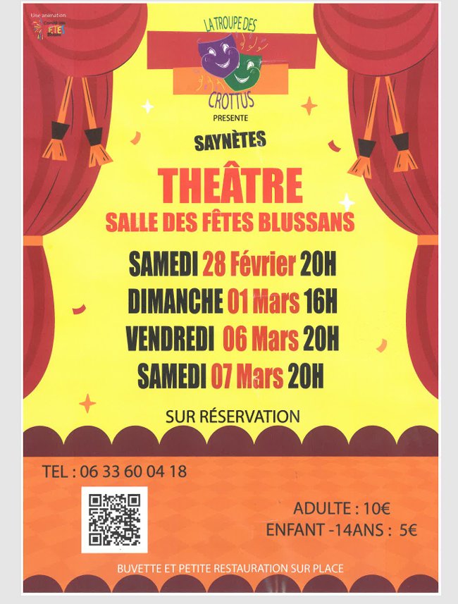 La Troupe des Crottus présente ses saynètes théâtrales à la salle des fêtes de Blussans. Plusieurs représentations sont organisées :