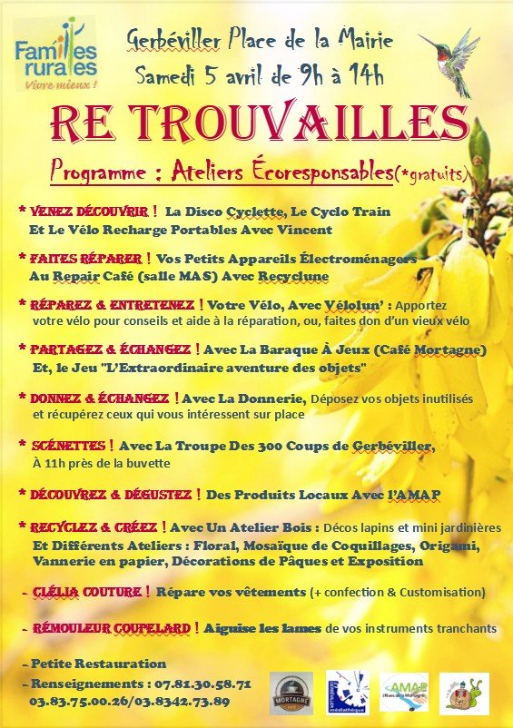 L’ association Familles Rurales organise des « Re Trouvailles », qui auront lieu le samedi 5 avril, de 9h à 14h, à Gerbéviller, place de la mairie et salles environnantes. Dans ce cadre, des Ateliers Ecoresponsables gratuits vous seront proposés, l’animation Disco cyclette / Cyclo train / Vélo recharge portables présentée par Vincent, un Repair Café avec Recyclune, des conseils et aide à la réparation des vélos avec Vélolun’, vous pourrez participer à différents jeux et ateliers, mais également, participation de l’AMAP, de la donnerie de Rozelieures, et La troupe des 300 coups de Gerbéviller pour des scénettes.