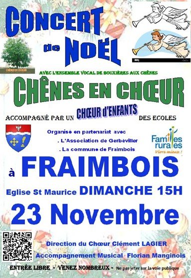 L’Association Familles Rurales de Gerbéviller et la commune de Fraimbois organisent un concert de Noël, le dimanche 23 novembre, à 15h, à l’Église St-Maurice à Fraimbois, avec l’ensemble vocal de Bouxières aux Chênes « Chênes en Choeur », accompagné par un Choeur d’Enfants des écoles. Entrée libre. Une collation sera servie à la fin du concert. N’hésitez pas à nous rejoindre !