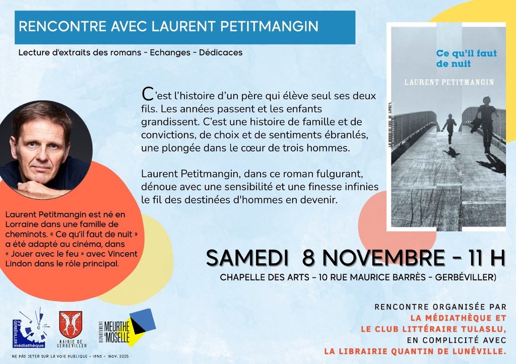 Le samedi 8 novembre à 11h, nous aurons la chance d'accueillir à Gerbéviller Laurent Petitmangin, l'auteur de plusieurs romans marquants.