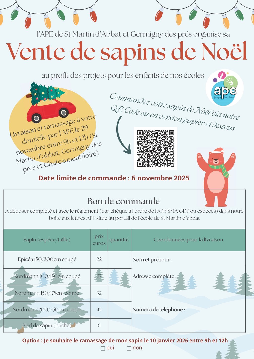 L'Association des Parents d'Elèves organise sa vente de sapins de Noël et de produits locaux au profit des projets pour les enfants des écoles LA CHARMILLE & LE GRAND CLAIR.