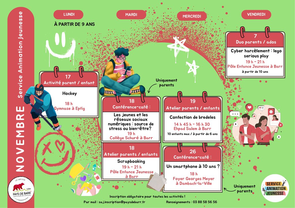 Envie de bouger, de réfléchir et de partager ? Le Service Animation Jeunesse du Pays de Barr est heureux de vous dévoiler son programme d'activités pour le mois de novembre 2025 !