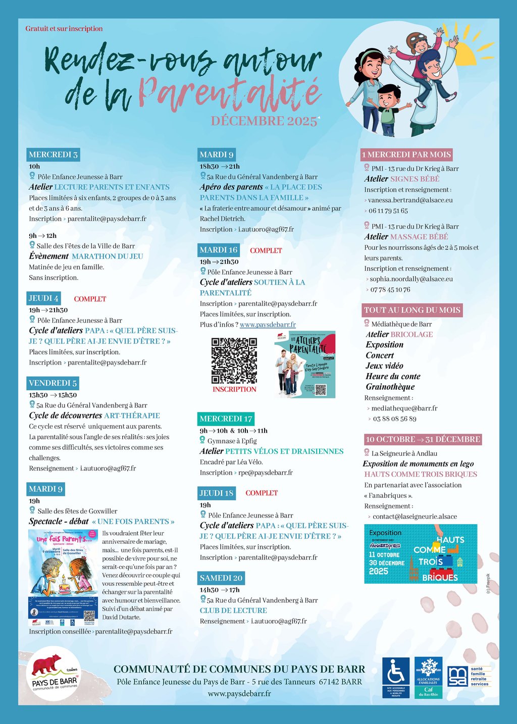 Le Service Enfance Jeunesse du Pays de Barr est heureux de vous présenter son programme pour le mois de décembre : « Les rendez-vous autour de la parentalité », un ensemble d'événements pour accompagner et soutenir les parents au quotidien.