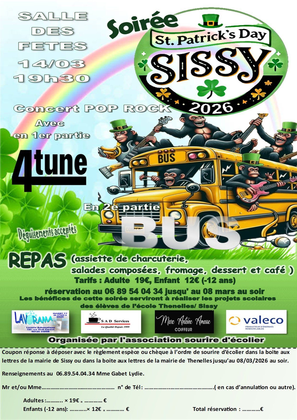 L'association sourire d'écolier vous attend pour une soirée folle, un repas et de la bonne musique. Cette soirée comme les précédentes vous promet de beaux moments. 💚🧡 Pour célébrer la St Patrick comme il se doit en avant-première les 4 tune, anciens élèves du lycée Henri Martin ont décidé de revivre l'expérience de la scène ayant gardé un très bon souvenir de leur premier passage à Sissy et l'apothéose de la soirée le groupe BUS qui déchire chaque année, nos fidèles musiciens vont vous faire danser et chanter. Le vert, l'orange le déguisement, le kilt 😁🤣 tout est autorisé et vivement recommandé 🤣💚🧡🍺🍻 hop hop hop on réserve ou on partage les amis/amies.🎸🎸 N'oublions pas les bénéfices seront reversés à l'école Thenelles / Sissy 😉💚🧡
