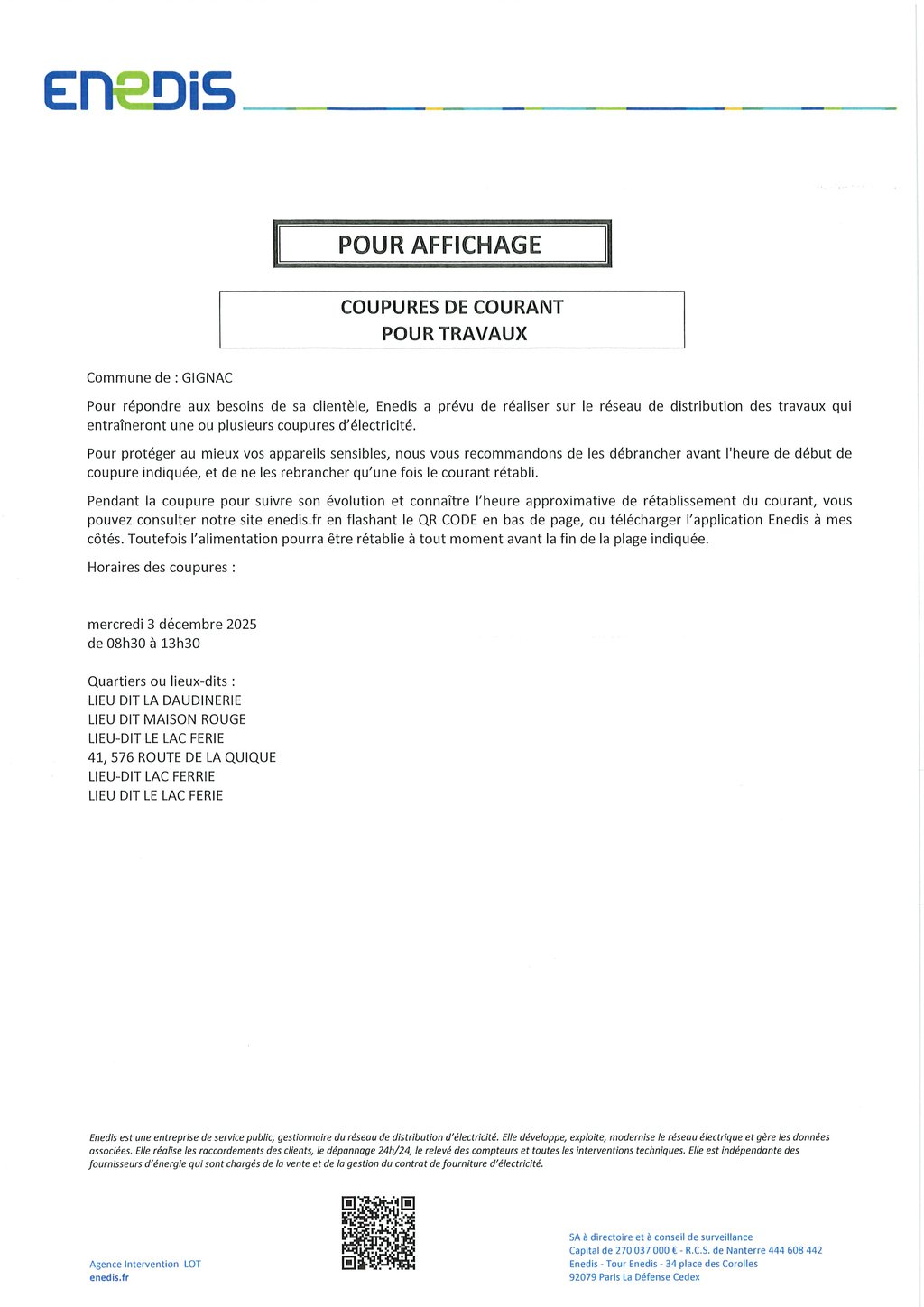 ENEDIS- COUPURES DE COURANT LE 03/12/2025