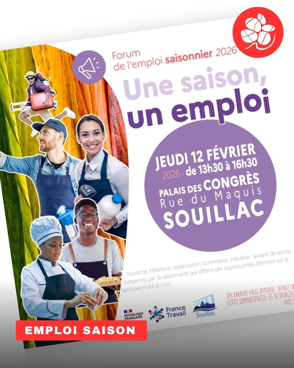 L’agence France Travail Souillac organise un forum spécial recrutements saisonniers pour le nord du Lot : vallée de la Dordogne, Rocamadour, Gouffre de Padirac et alentours. Tourisme, commerce, services, industrie… De nombreux employeurs recrutent pour la saison d’été 2026.