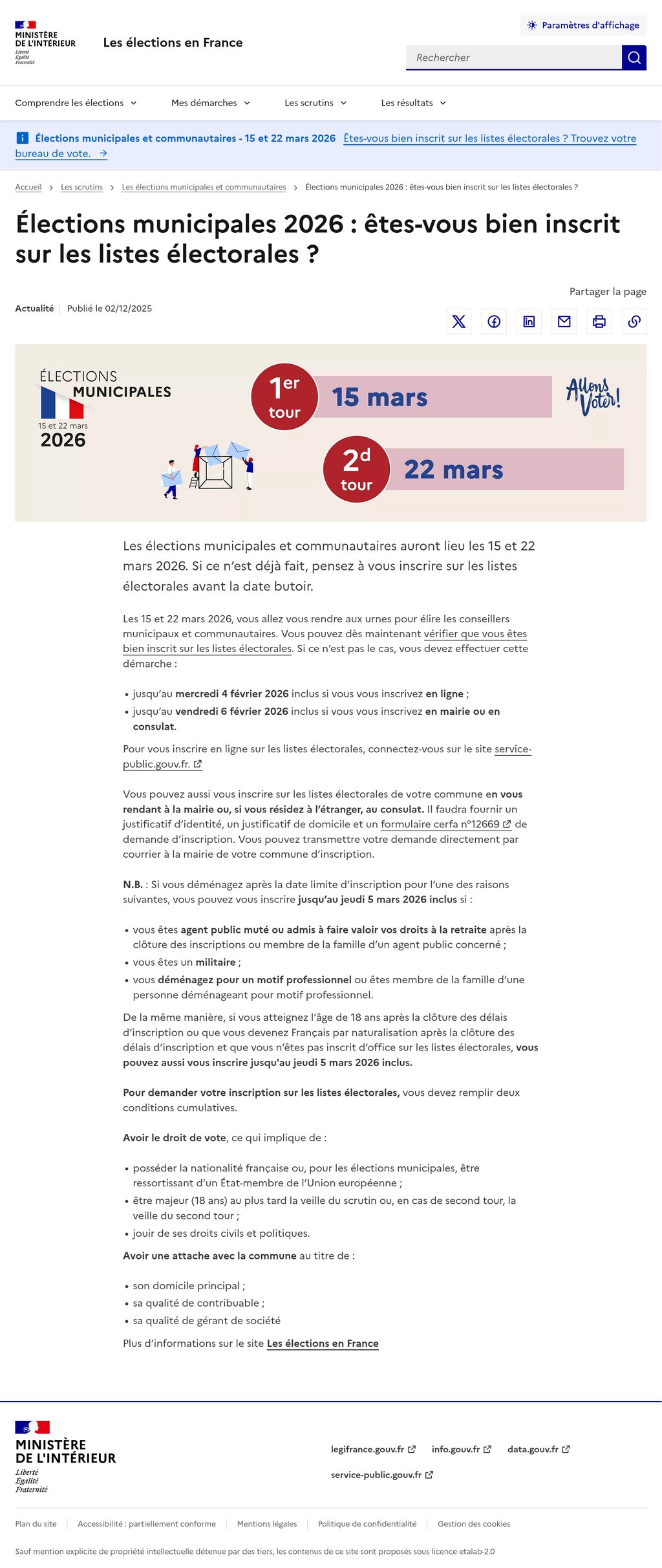 Les élections municipales et communautaires auront lieu les 15 et 22 mars 2026. Si ce n’est déjà fait, pensez à vous inscrire sur les listes électorales avant la date butoir.