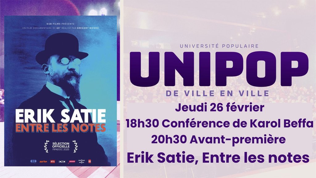 Mais aussi un nouveau rendez-vous Unipop de ville en ville avec une conférence sur Erik Satie par Karol Beffa suivie d'un documentaire Erik Satie, entre les notes.