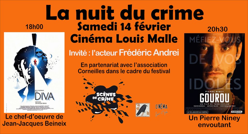Le samedi 14 février, en partenariat avec L'association Les Corneilles nous participerons au festival Scènes de crime avec une soirée spéciale Nuit du crime, projection de Diva, premier film de Jean-Jacques Beineix à 18h00 puis Gourou de Yann Gozlan avec Pierre Niney à 20h30.