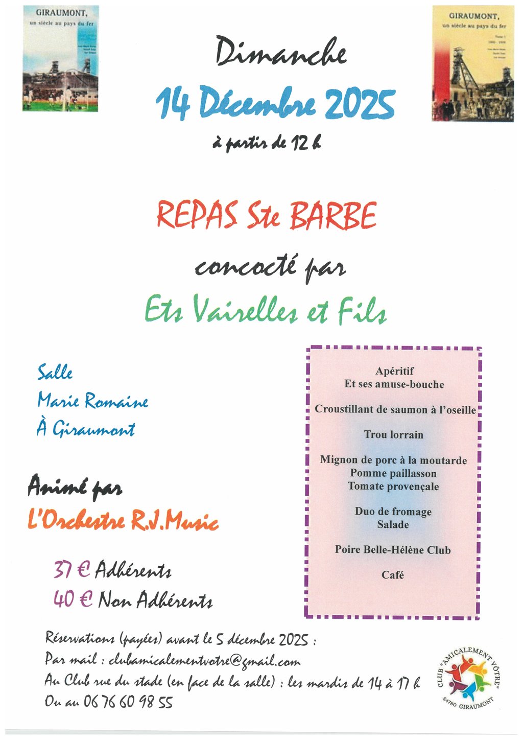 ๐๐ ๐๐ฅ๐ฎ๐ ๐๐ฆ๐ข๐๐๐ฅ๐๐ฆ๐๐ง๐ญ ๐รด๐ญ๐ซ๐ propose d'honorer les Mineurs de Fer Giraumontois et des Alentours ร l'occasion de son traditionnel repas dansant, animรฉ par R.V. Music