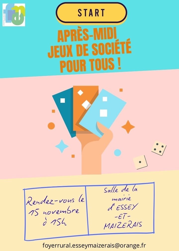 Rejoignez-nous le samedi 15/11/25 dès 15h à la salle de la mairie d'Essey-et-Maizerais pour une après-midi jeux de société.