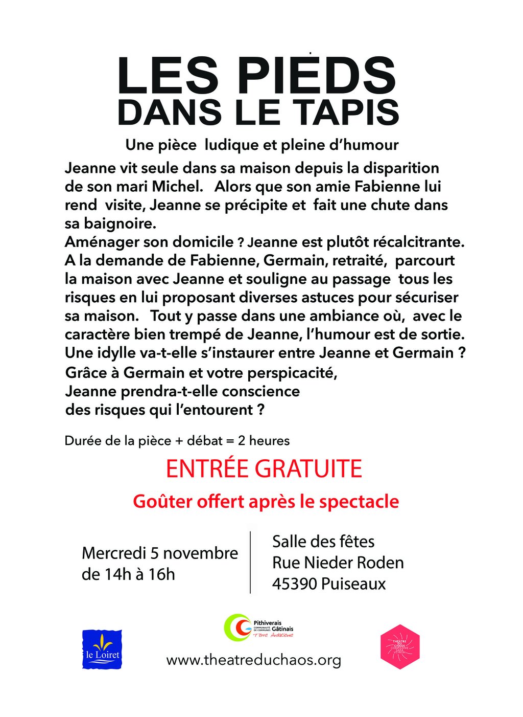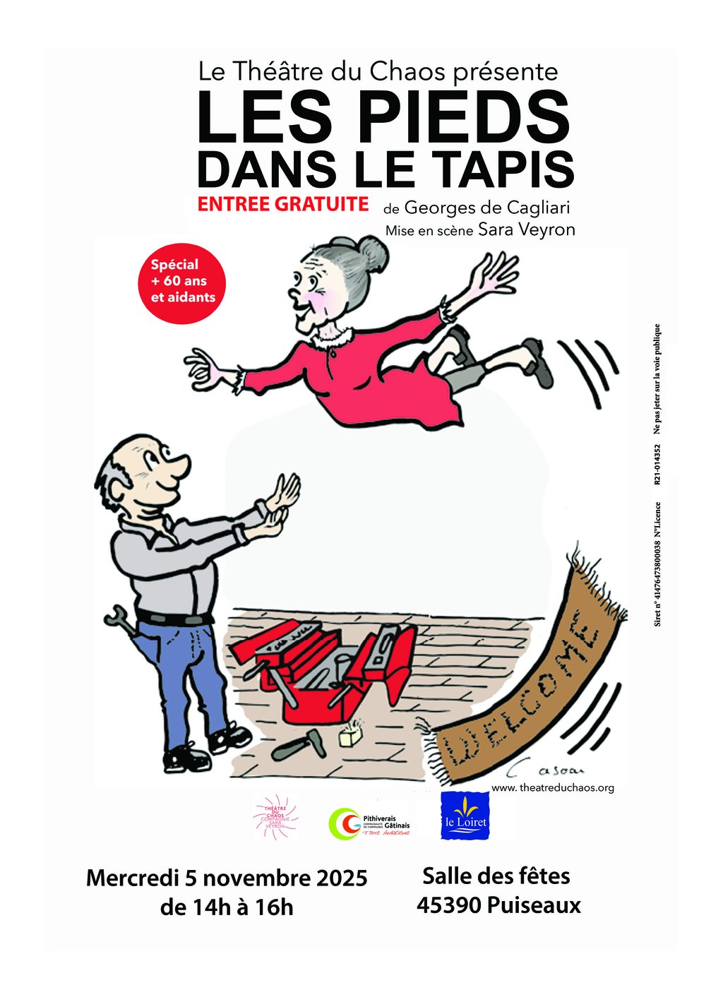 La Compagnie Théâtre du Chaos présentera la pièce « Les pieds dans le tapis », une comédie pleine d’humour et ludique sur les dangers du quotidien à la maison le mercredi 5 novembre 2025 à 14h à la salle des fêtes de Puiseaux.