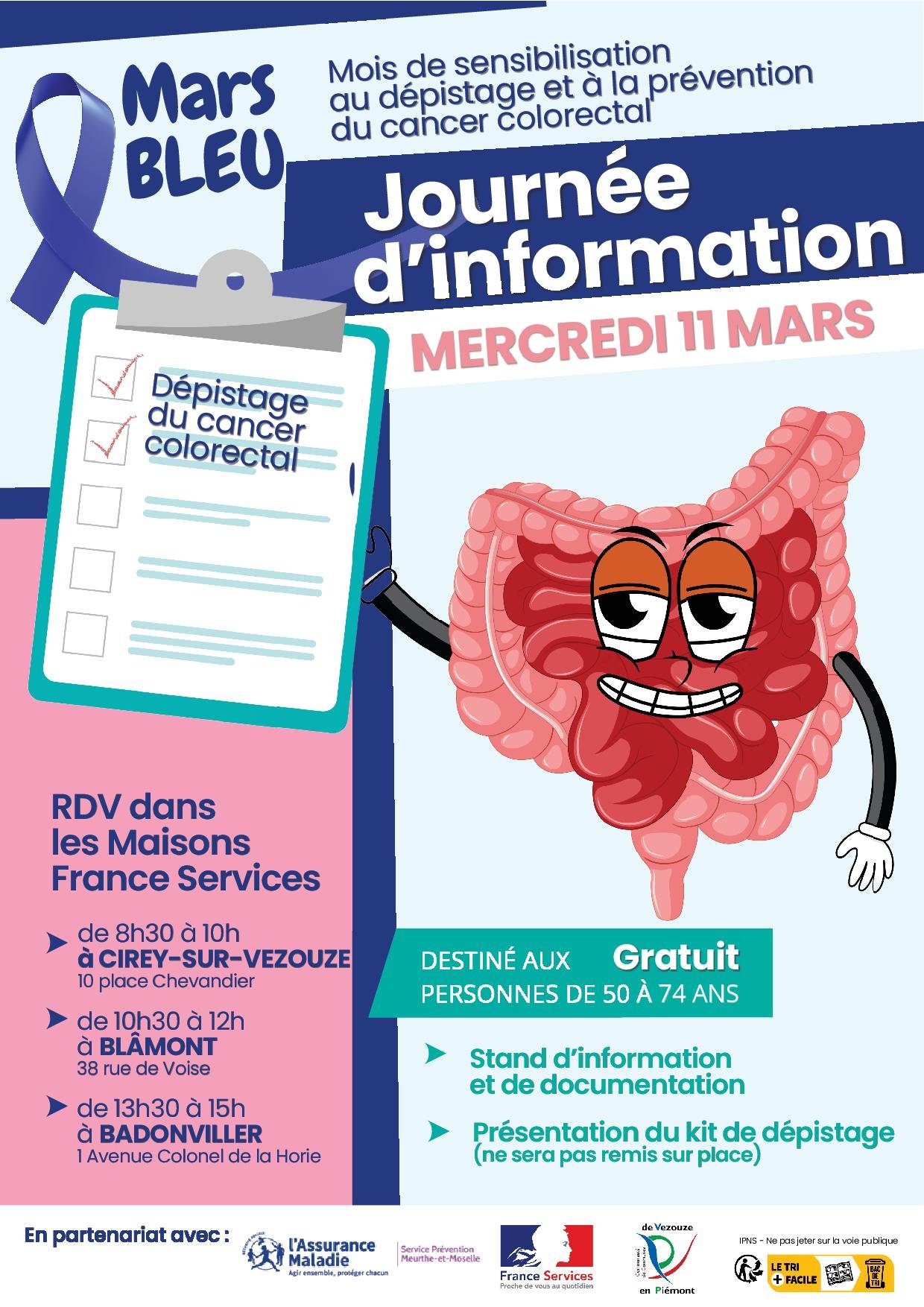 Dans le cadre de Mars Bleu, mois de sensibilisation au dépistage et à la prévention du cancer colorectal, les Maisons France Services en lien avec la CPAM de Meurthe-et-Moselle, accueillent une journée d’information et de sensibilisation à destination des femmes et des hommes de 50 à 74 ans.