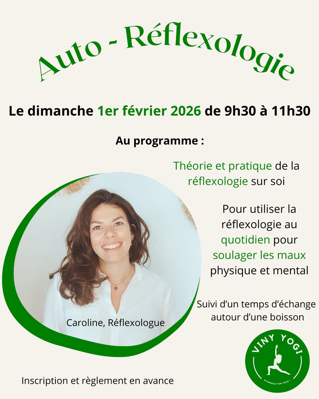Le dimanche 1er février, l'association Viny Yogi vous propose un atelier pour apprendre à pratiquer l'auto réflexologie, de 9h30 à 11h30. Encadré par la réflexologue Caroline Stouls, vous pratiquerez directement sur vos mains et pieds pour prévenir et soulager les maux physique (dos) et mental (stress), dans une ambiance cocooning favorisant la relaxation. A la fin de l'atelier, un mémo vous sera remis autour d'une boisson chaude. 15€ pour les adhérents/ 22€ pour les extérieurs à l'association. Inscription obligatoire sur Hello Asso (seulement 10 places!) de Viny Yogi. Contact : Marion au 07 49 44 08 92 ou sur asso.vinyyogi@gmail.com.