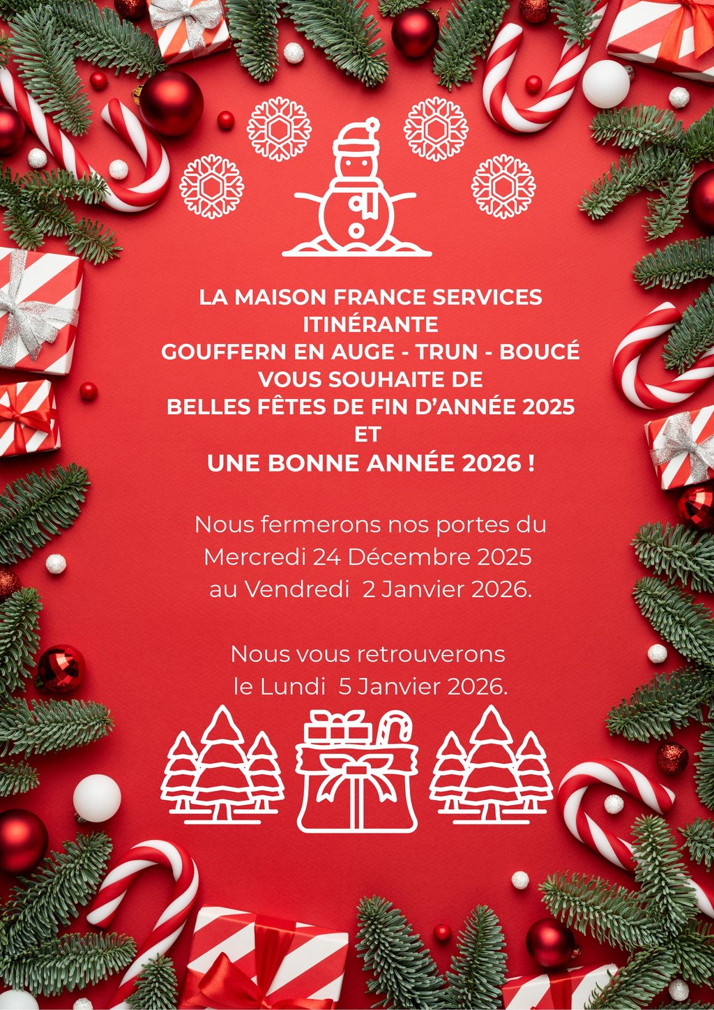 La Maison France Service itinérante de Gouffern en auge, Trun et Boucé sera fermée du 24 décembre 2025 au 2 janvier 2026.