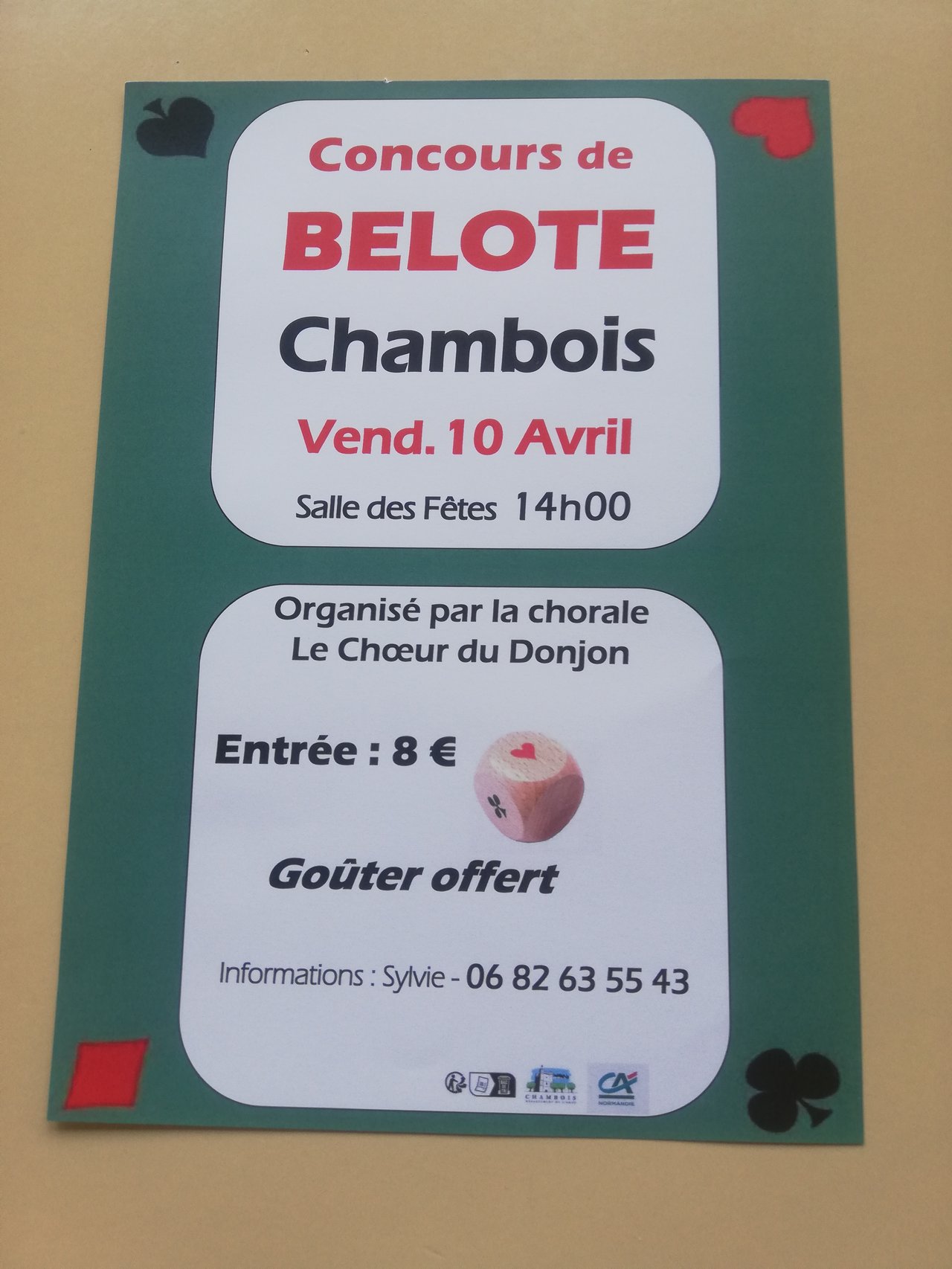 Concours de belote, organisé par la chorale "Le Chœur du Donjon" le vendredi 10 avril 2026 à 14h00.